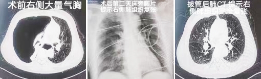 “张力性气胸属于临床急症,胸膜腔内高压会持续压迫健侧肺和心脏大血管,必须在最短时间内排气减压。”呼吸与危重症医学科主任秦丰介绍,团队依据科室成熟的急危重症救治规范,当即制定急救方案,在完善术前准备后,为患者实施胸腔闭氏引流术。随着高压气体快速排出,患者呼吸困难症状缓解,血氧饱和度回升至94%。术后第二天,胸片显示患者右侧肺组织复张良好,纵隔位置恢复正常,生命体征逐渐平稳。在胸腔引流管连接水封瓶无气体溢出,提示胸膜破口已完全愈合后顺利拔管。拔管后再次行肺CT提示患者双肺多发肺大泡,考虑患者此次气胸与患者频繁咳嗽引起肺大泡破裂有关。