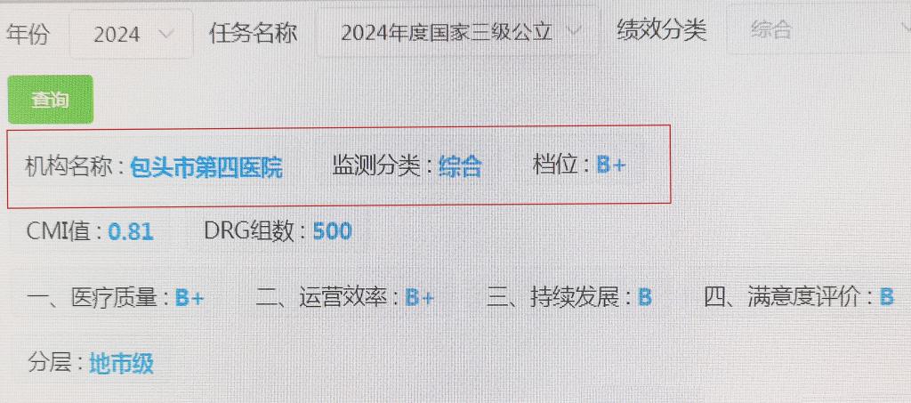 成绩属于过去,奋斗成就未来。B+级评价既是对医院三年砥砺奋进的权威认可,更是迈向新征程的全新起点。站在“十五五”开局之年的历史节点上,包头市第四医院将以习近平新时代中国特色社会主义思想为指导,深入贯彻落实国家三级公立医院绩效监测导向要求,以评促建、以评促改,持续推动医院高质量发展,为包头市打造医疗高地贡献更大力量,为健康中国建设谱写更加辉煌的篇章。
